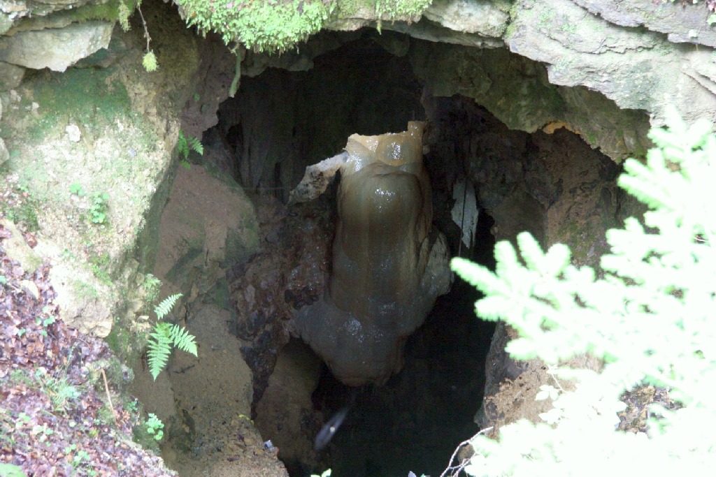 plätschert Wasser über einen großen Tropfstein. Das Rinnsal genügte offenbar um eine Höhle auszulaugen. |